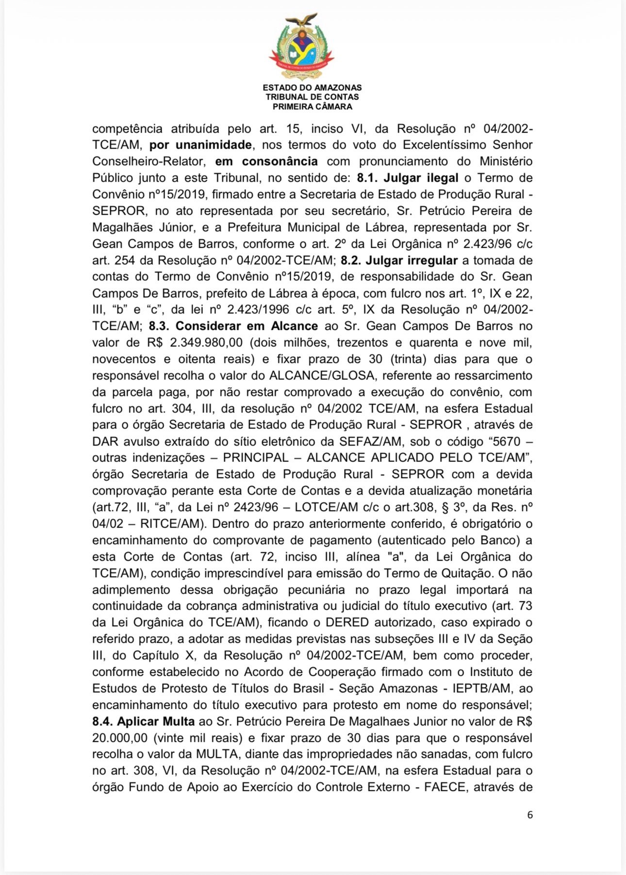 A Primeira Câmara do Tribunal de Contas do Estado do Amazonas condenou o ex-prefeito de Lábrea, Gean Campos de Barros, a devolver R$ 2.349.980,00 aos cofres públicos por irregularidades na execução do Convênio nº 15/2019, firmado com a Secretaria de Estado de Produção Rural (Sepror).